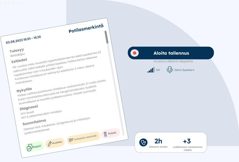 Lääkäreille, hoitajille ja erityisasiantuntijoille suunniteltu ratkaisu, joka nopeuttaa ja helpottaa potilasmerkintöjen tekemistä. Skaalautuu tarpeidesi mukaan ja sopii kaikenkokoisille tiimeille.