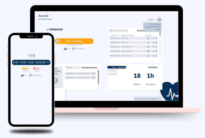 Yhteinen matkamme alkoi HealthX:stä, Helsingin yliopiston, Helsinki Think Companyn ja Helsingin kaupungin toteuttamasta yrityshautomosta, jossa kehitimme ideaamme asiantuntijoiden tuella. Innovatiivisuutemme huomattiin, ja pääsimme mukaan DigitalWell Ventures -kiihdyttämöön, joka tukee pohjoismaisia terveys- ja teknologiastartupeja. Yhdessä terveydenhuollon ammattilaisten ja tekoälyyn perehtyneiden sovelluskehittäjien kanssa loimme työkalun, joka vapauttaa ammattilaiset keskittymään potilaisiin, paperitöiden sijaan. Tavoitteemme on selkeä—liity mukaan rakentamaan kestävämpää terveydenhuoltoa.